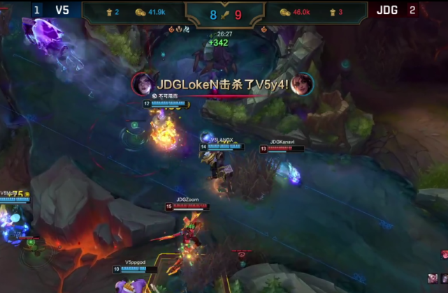 26分钟,JDG佯装打大龙,实则逼团。V5刚来到现场,JDG全员进场,直接秒杀Y4的莎弥拉。主输出阵亡,V5溃不成军,只能眼看着JDG拿下大龙。