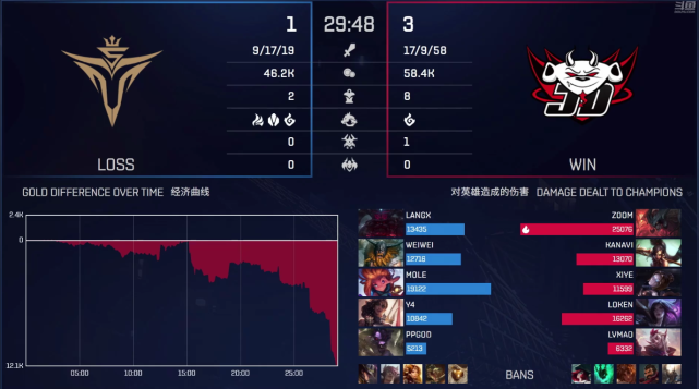 在随后的小龙团中,V5先行落位,但是Kanavi豹女成功抢下大龙!lvmao洛完美开团,最后由zoom剑魔完成收割!JDG赢下团战!