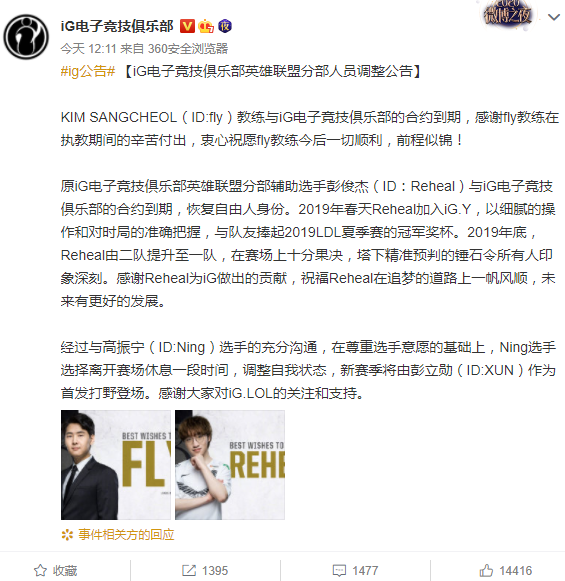 iG这次官宣了两名选手和一名教练的转会期情况。Fly教练与iG的合约到期,正式离队。此前从二队提拔上来的小辅助Reheal也一同离队。最后一条则是重磅消息:打野选手Ning将在新赛季暂别赛场,春季赛确定不会登场。