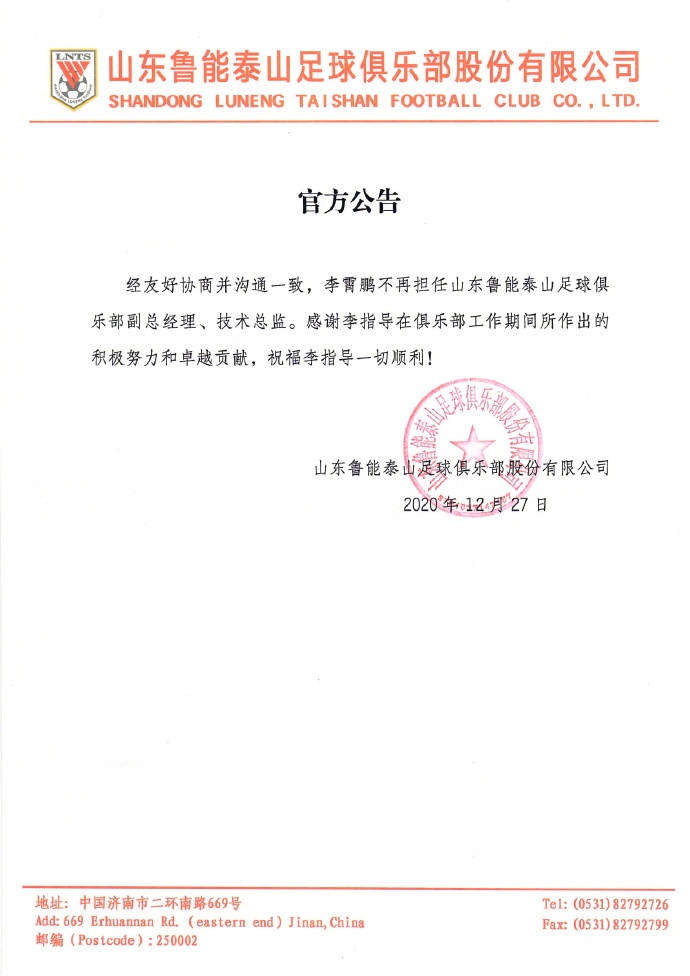祝福中国土帅!山东鲁能官方:李霄鹏不再担任副总