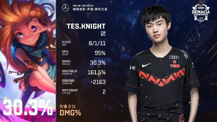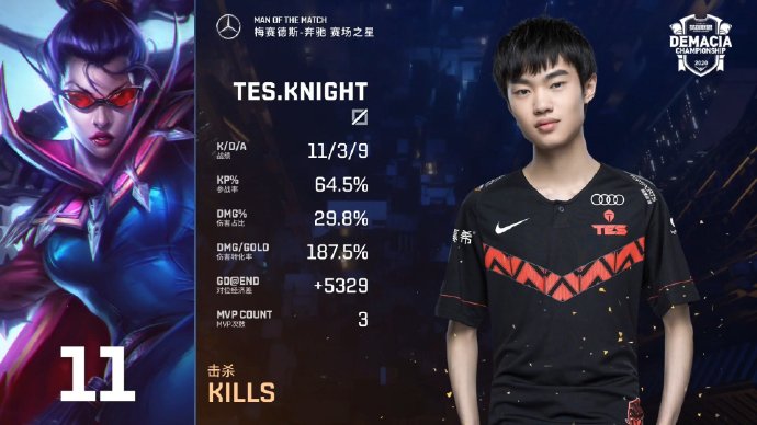 北京时间12月27日,2020英雄联盟德玛西亚杯决赛,TES以3-0横扫WE获得冠军,这也是他们队史上首个德杯冠军。第二局TES中单选手Knight选出了薇恩,与JackeyLove选手的维克托进行摇摆,其中Knight选手发挥出色,不仅做到了线上完美压制,还做到了团战无解输出,获得本次系列赛的MVP。