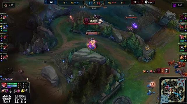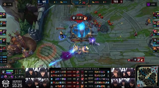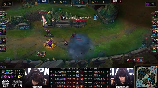 拿到大龙后的TES从下路发起推进,JackeyLove的烬架狙配合队友拆掉WE下路高地。背水一战的WE开启团战,尽管青钢影进场吸引了TES四人的火力,但是369的奥恩同样在前面牵扯了很多,凭借着JackeyLove的三杀一波拿下比赛。