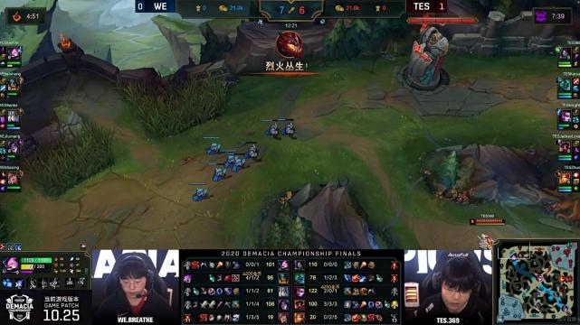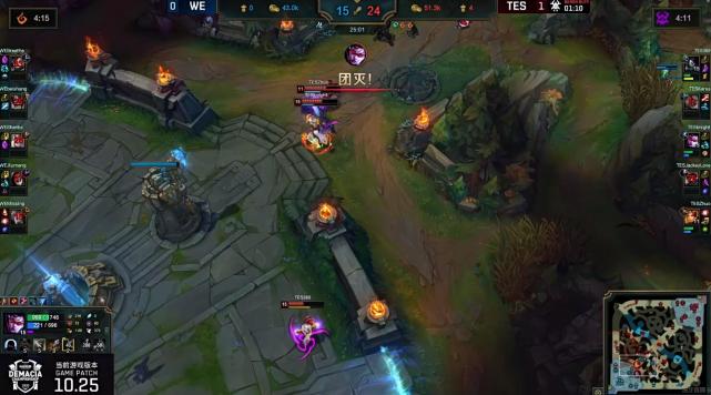 在中期几波团战中,TES连续打赢团战成功扩大经济优势,并且连续两条火龙。25分钟,拿到大龙的TES直接在中路开启团战,Knight的薇恩在团战中疯狂输出拿下三杀,顺势推掉了WE中路高地,TES经济领先达到8k。
