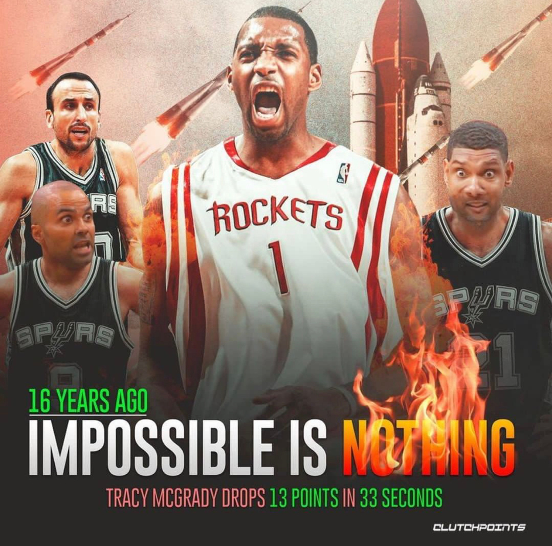 时光回溯到2004年12月10号,西南区内战在丰田中心打响。整场比赛结束前1分钟,火箭还落后两位数,即使全场比赛在马刺两位防守悍将的围追堵截下只投出了24中8三分球8中1的命中率,但在面对即将输球的绝境下,麦迪依然站了出来。不到比赛最后最后一刻,你永远不能妄下定论。比赛结束前40″火箭球权,麦迪持球推进开启了英雄般的个人表演。皮球一次次的从三分线外被麦迪神奇的扔进;35秒第一个三分、24.3秒第二个三分并加一个罚球、11.2秒第三个三分;1.7秒当投进最后一个三分时,所有情绪瞬间喷涌而出。最后帕克投篮不中火箭以81-80逆转战胜马刺,神迹般的35秒13分也画上了圆满的句号。