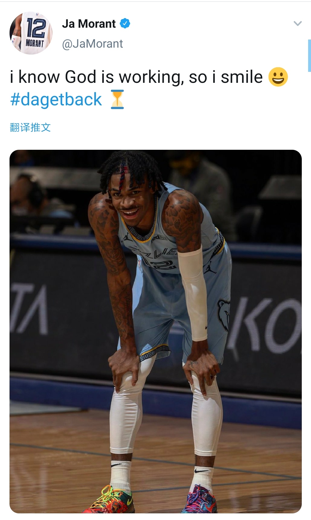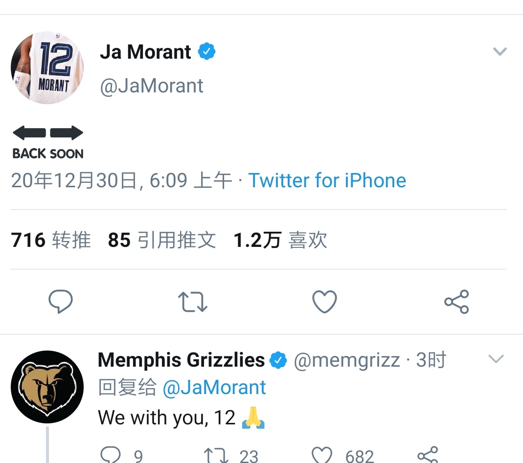 莫兰特发推:很快回来 灰熊官方也回复道:我们与你同在