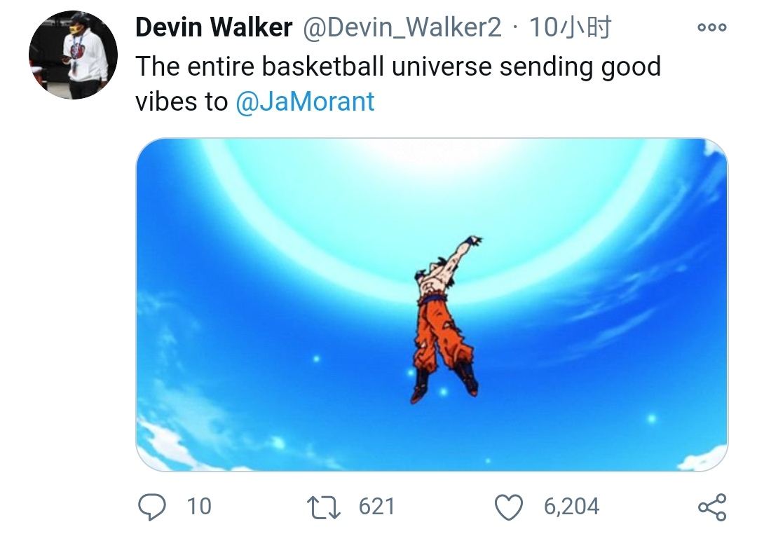 今日国外网友晒出一张悟空聚集元气弹能量的照片并写道:“全篮球宇宙给你输送能量”并@莫兰特 莫兰特也点赞此条推特