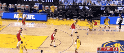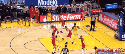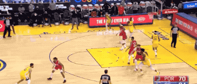 在这场比赛里,库里既有这种哈登式的连续胯下运球找节奏+晃动后出手的面框单挑三分: