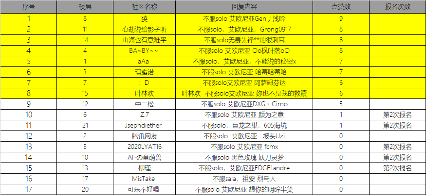 腾讯体育社区英雄联盟SOLO(单挑)赛第二周预选名单公布,点赞数前8的选手获得本周的参赛资格。