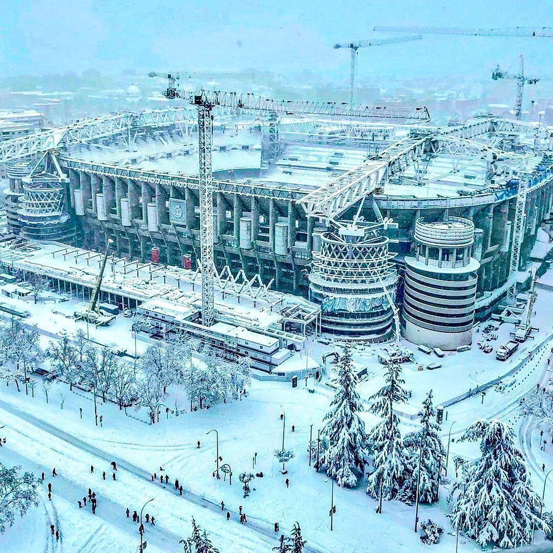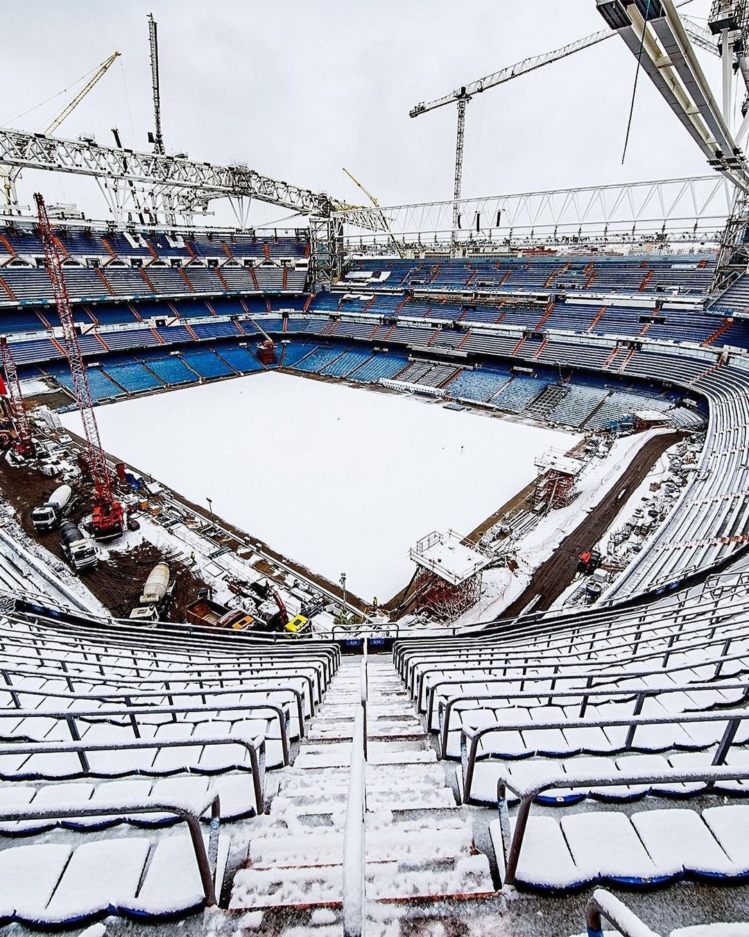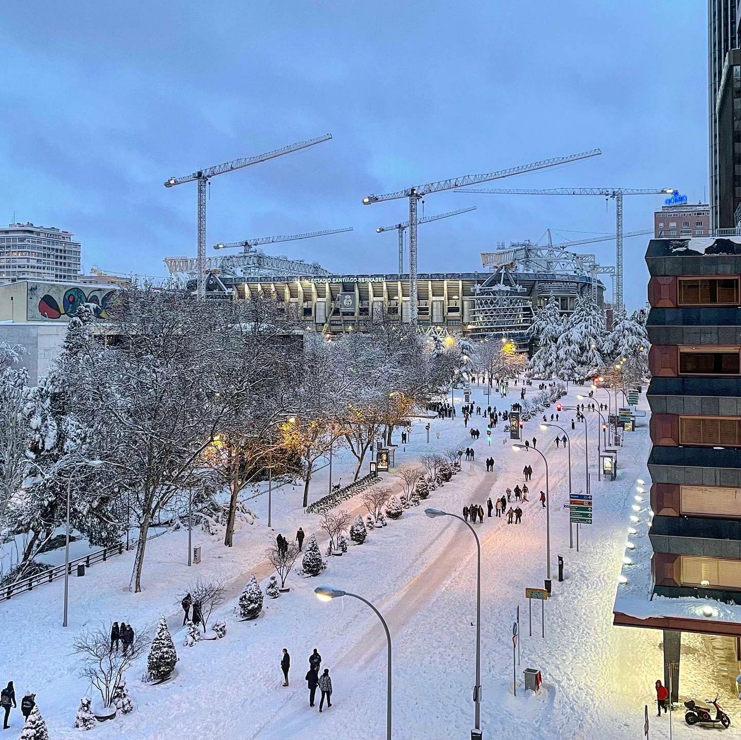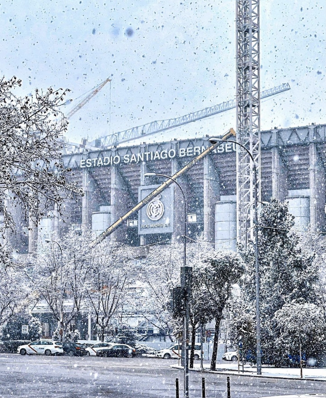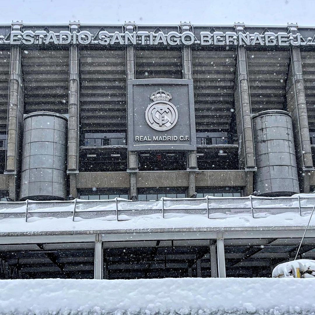 近日,西班牙持续受暴雪天气影响,皇马官方晒出一张伯纳乌球场被积雪覆盖的图片。