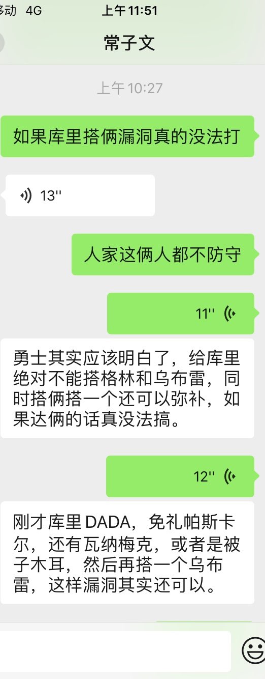 作为铁杆儿勇蜜说句公道话:这场别说输了,就是赢了也是胜之不武!这场替补没问题,问题主要都是首发,威金斯和怀斯曼也属于正常。格林 乌布雷大漏洞,库里当然打的也很烂虽然box1!但是,最大问题就是科尔sb!第二节就看出来,无论前几场,还是这场格林和乌布雷绝对不能同时在场,如果有记忆:以前KD 汤普森 库里 海啸兄弟都带不动一个漏洞格林,现在俩漏洞库里怎么带的动?领先15分我就告诉勇士朋友,如果第四节不同时上格林乌布雷就能赢,如果上领先20也得输!科尔真的太固执!