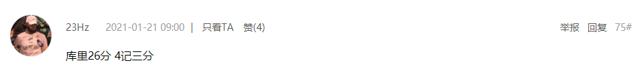 今天库里得到26分,命中4记三分球,恭喜75楼的“23Hz”同学,第一个猜对,请留意站内信,我们会和你联系~