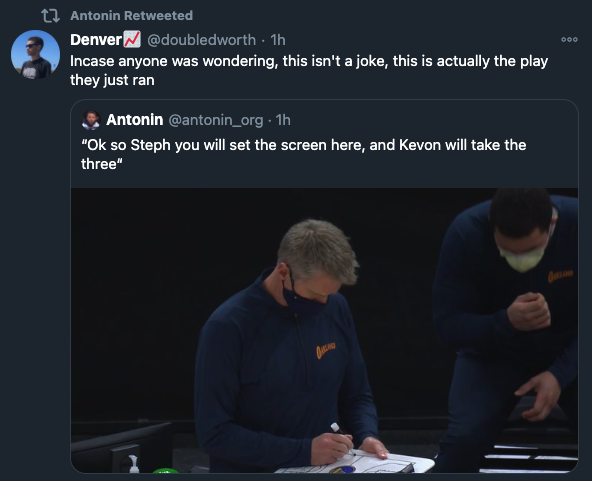 刚刚在推上看到了一个笑话,说科尔为勇士设计的战术是库里为卢尼挡拆让后者投三分。。刚准备开始笑,发现转发这个笑话的人说:这不是玩笑,这就是勇士刚刚跑的那个战术。。。唉,我感觉库里和勇士都被合理这二字害了#库里里程碑勇士惨败#