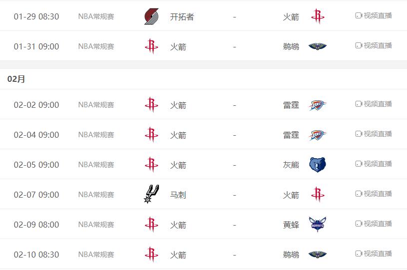 未来8场火箭的对手分别是:开拓者、鹈鹕、雷霆x2、灰熊、马刺、黄蜂、鹈鹕,都不算太强。