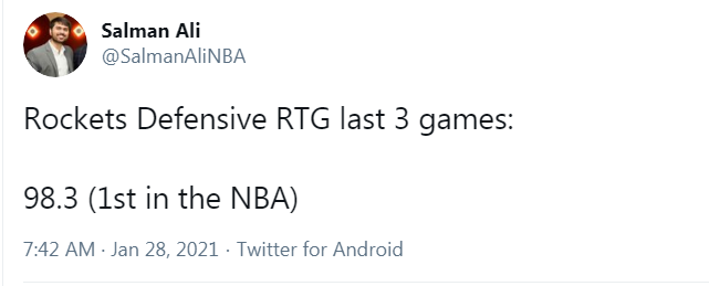 在三连胜期间,火箭随队记者Ali社交表示:“这三场比赛中,火箭防守效率是98.3,排名联盟防守效率第一位”,进攻天赋不足防守来弥补,这就是塞拉斯执教后为球队带来的改变,其实这支球队在完全健康时,依旧具备不俗的冲击力,沃尔与奥拉迪波搭档首场首发,两个人均具备出色的防守能力与突破组织能力,将戈登放在替补位置弥补火力不足,中锋拥有伍德与考辛斯,不要忘记内线也有老将塔克坐镇,其实只要火箭想赢球不是难事,最重要的是态度。