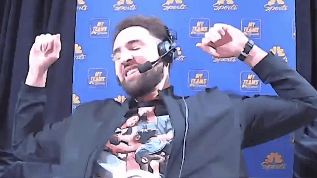 勇士对战活塞的比赛中 库里的三分刚刚出手还没进框呢解说员的克莱就已经开始庆祝了:“If he makes this, oh my goodness”。进球后库里手指着解说包厢的克莱,向他致敬,还得是你俩啊!