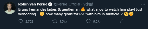 英超第23轮,曼联主场3-3埃弗顿,B费策动卡瓦尼的破门,还亲自攻入一脚吊射。前曼联球星范佩西感叹道:“看B费踢球简直是一种享受!我要是和他搭档,能进多少球啊?”