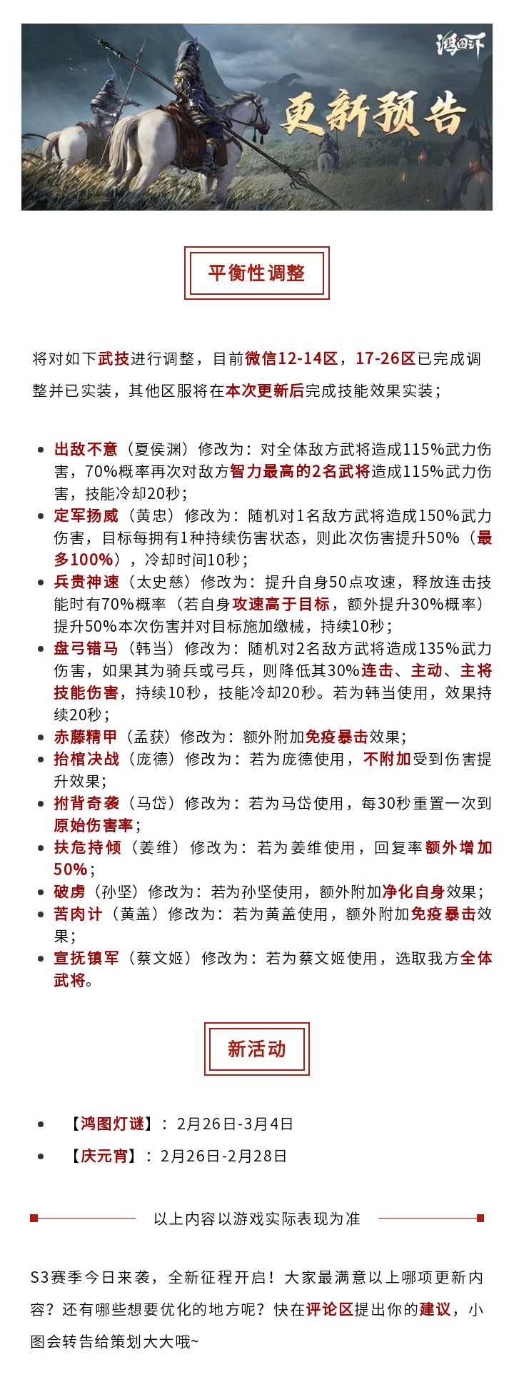 为了帮助大家更好地体验游戏,我们收集了大家的意见,并计划进行一次维护。此次维护将从2月24日凌晨5点00分开始,预计维护2小时。请各位主公提前安排游戏时间,稍作休息。
