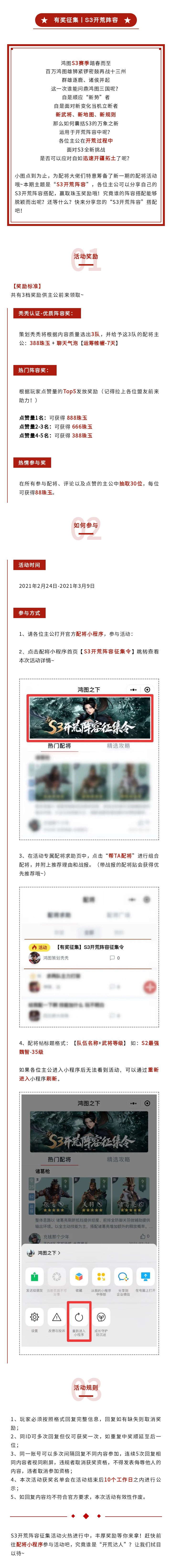 随着S3赛季的开启,《鸿图之下》配将小程序有奖征集活动再度来袭,S3开荒阵容征集令今日发出!此次配将活动将送出珠玉奖励助力新赛季开荒,福利满满不容错过!配将大佬们快随小图一同了解本次配将活动详情,大展身手吧~