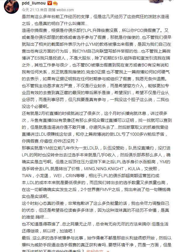 热竞技了解到:最近电竞圈可不算太平,其中大家最痛恨的假赛可谓谣言四起,尤其是我们熟悉的超主播PDD身陷囹圄,正处于极度的焦虑之中,尤其在BO打假赛被爆出之后,相关的各种话题全部被带了起来,PDD作为曾经投资人更是节奏被带的飞起,“YM七过LPL而不入”“LDL真的赚钱”这些原本只是一句流传或者是直播时随意说的话现在全被翻了出来,不得不说太火也不好啊。