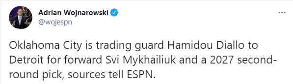 雷霆交易了迪亚洛,换来活塞的米哈伊柳克和一个2027次轮签