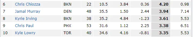首先GP和MPG的数据,每个人都不一样!这就导致这个数据均下来有点假!有的球员打了20场好球就养伤去了!然后数据排第一!是不是就代表他这个赛季能力出众了?显然不是这样的!