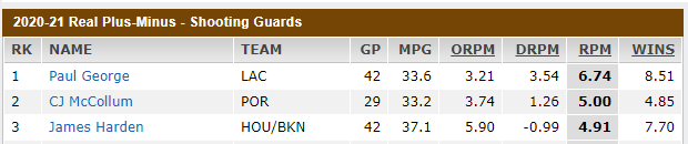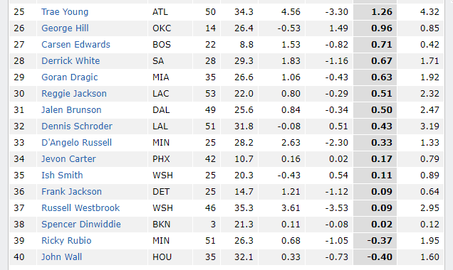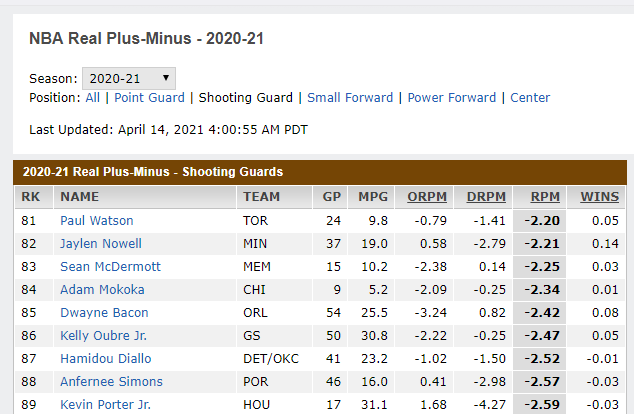 然后看ORPM和DRPM,这个只能说在进攻端和防守端,该名球员的每百回合里面的球队分数情况!是净胜分还是净负分!这个和该名球员个人能力能够挂钩?一个球队上去5个人当时都不得分!也都不防守!我说平摊到每个人头上。分数自然就下来!