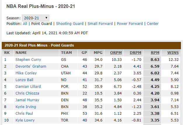 RPM? ?球员估计球场上对球队表现的影响,以每100次进攻性和防御性得分的净差来衡量。这个数据考虑到队友、对手和其他因素。