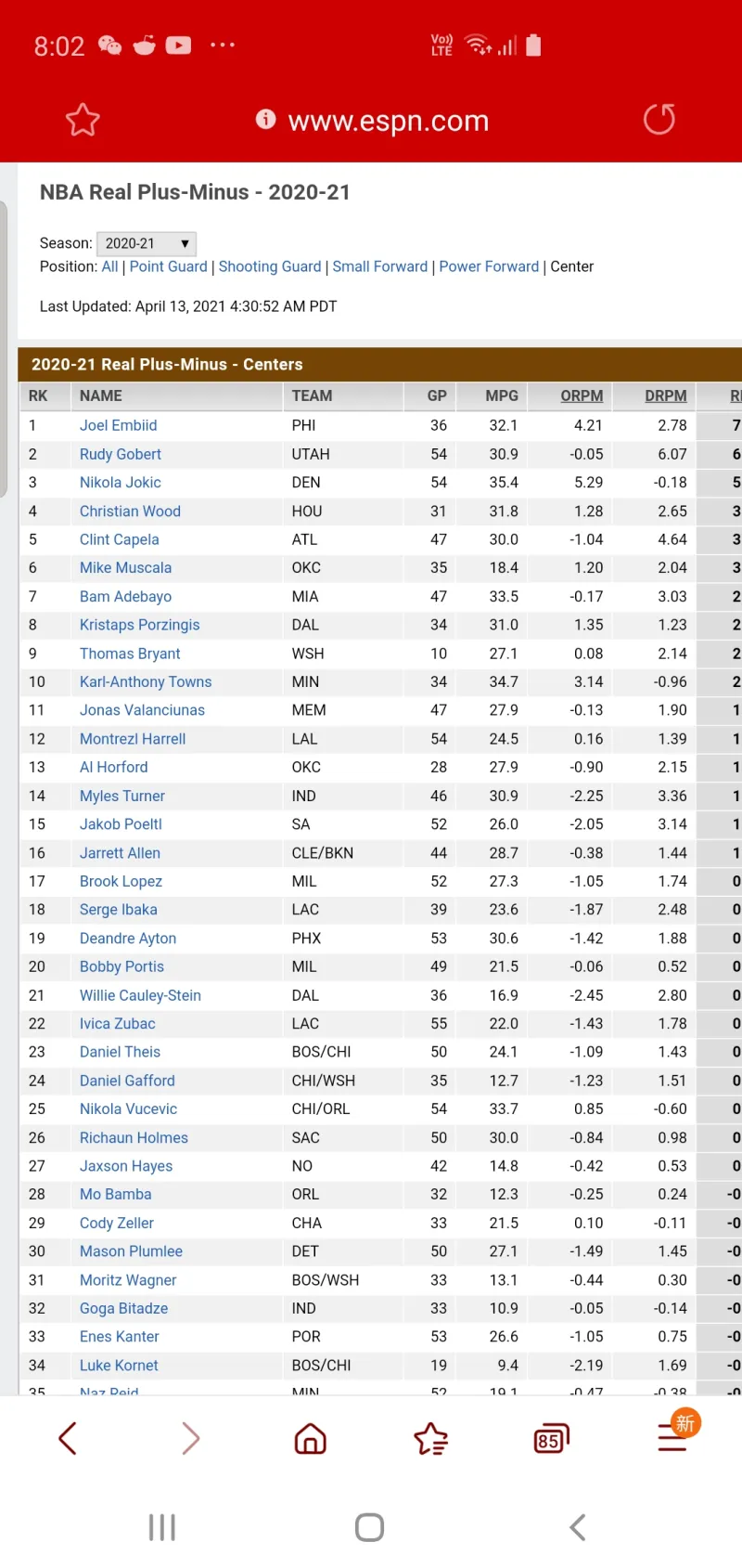 伍德ESPN真实防守正负值中锋第4,联盟第19