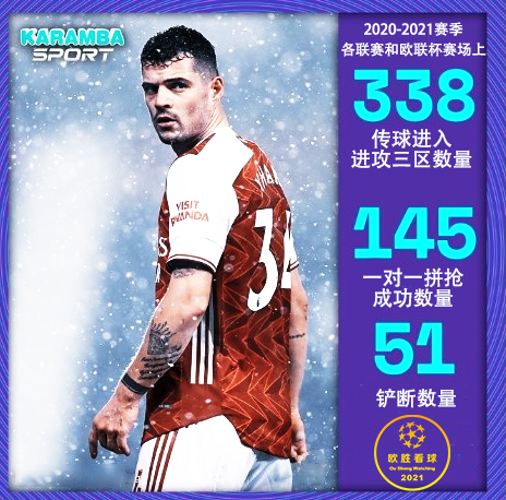 在2020-2021赛季在各项联赛和各个欧联杯赛场上,阿森纳中场扎卡的多项数据都位居球队内首位,这其中包括有铲断数量(51次)、传球进入进攻三区数量(338次)以及中长传成功数量。另外,在一对一拼抢成功数量(145次)、夺回球权数方面,扎卡都可以位居阿森纳全队第二。