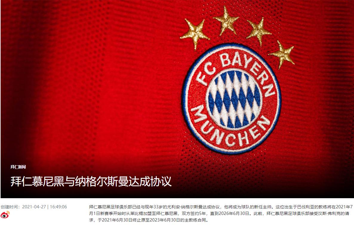 北京时间4月27日下午,德甲豪门#拜仁#在官网宣布,球队与现任主帅#拜仁主帅弗里克# 的合同会在今年的6月30日终止。目前在莱比锡执教的纳格尔斯曼将会在下赛季担任拜仁主帅。根据此前媒体的报道,#纳格尔斯曼执教拜仁# 的违约金最高2000万欧元,同时拜仁会给其提供一份为期五年年薪800万欧元的合同。