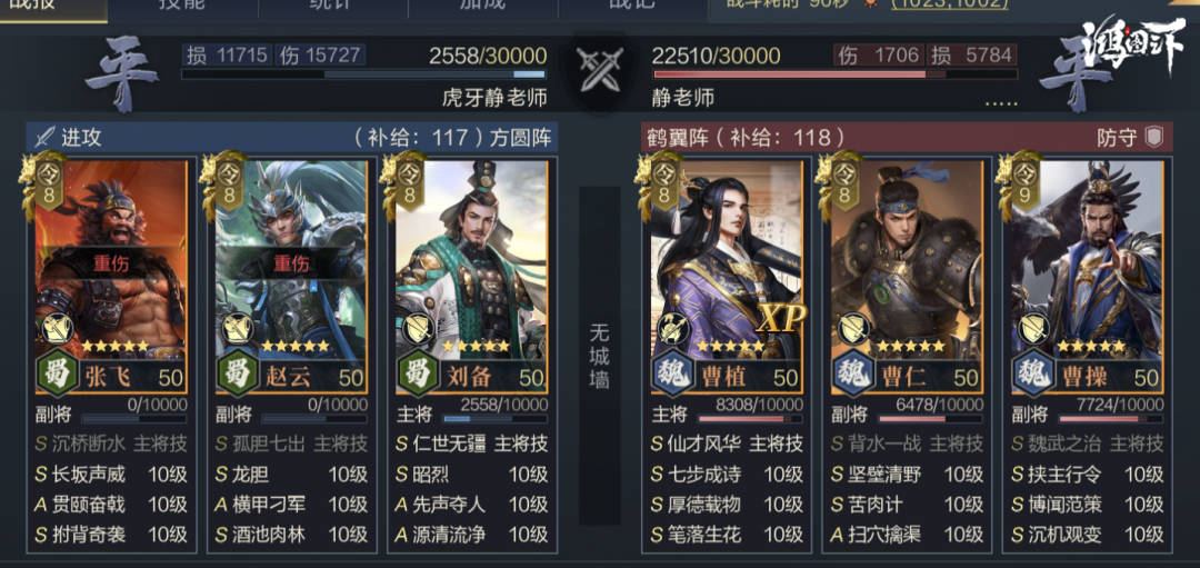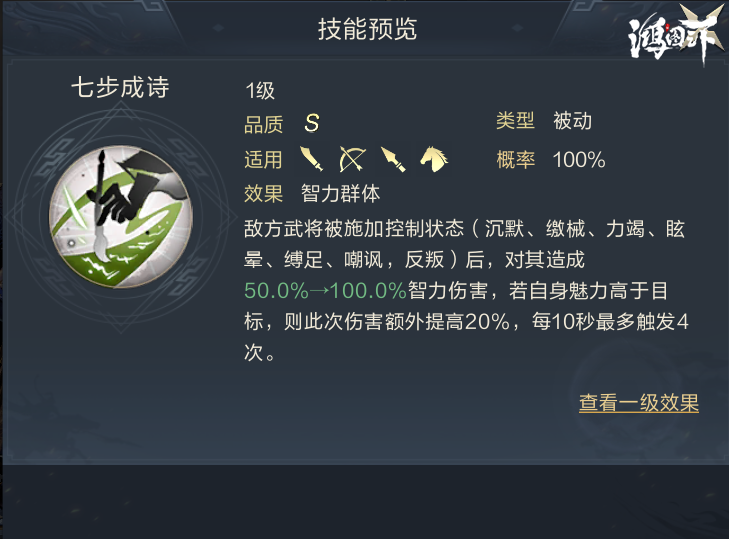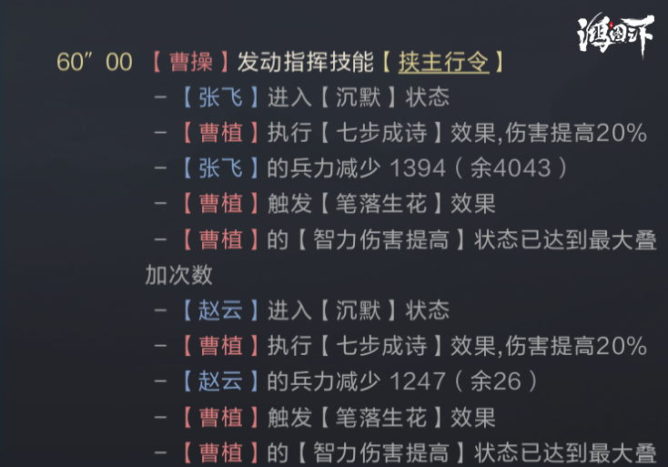 沉机观变不仅能对全体造成150%的智力伤害,还能使兵力最低的武将受到治疗效果提升50%,持续时间20秒,能够为曹仁或兵力最低的武将提供很好的续航。