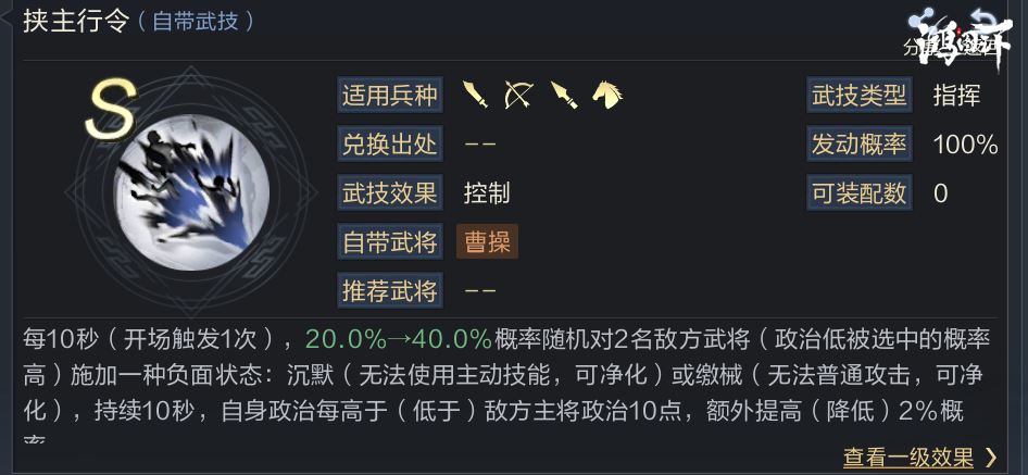 曹操的六维属性成长值较高。指挥技能挟主行令开场触发一次,每10秒触发一次,能够稳定释放,不受控制;并且依靠政治属性,可以打出沉默或缴械两种状态(每高于敌方主将政治10点,则额外提高2%,如果高于对方政治100点,则提高20%)。因此推荐全政治加点,来提高曹操的控制能力。