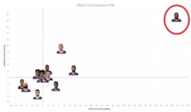 ? ? ? ? 快船和独行侠7场比赛,美媒晒出了快船球员攻防表现统计图,横轴表示该球员在场时球队每回合得几分,纵轴表示该球员在场球队少失几分。