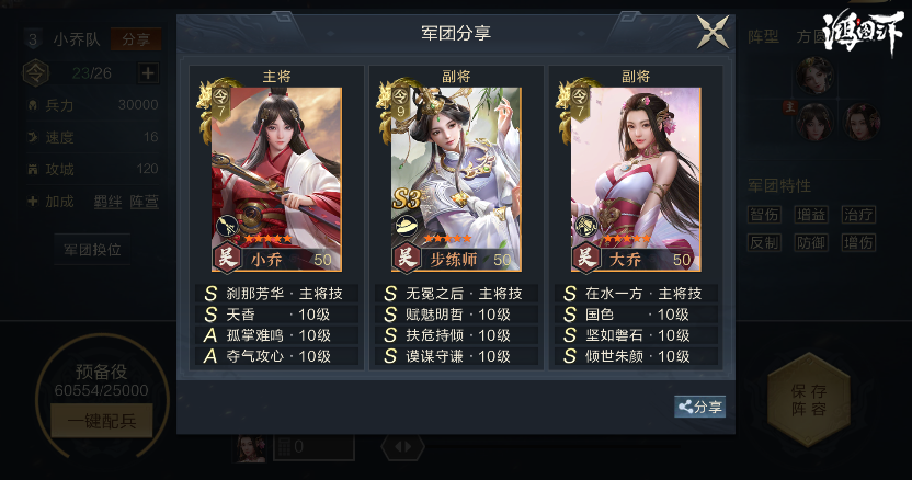 之所以没有用步练师而是陆抗,主要是因为步练师妹妹队虽然肉,但伤害稍微差一些,所以使用了输出更高的陆抗来做前排。大乔携带坚如磐石+筛金鼓骇,就是为了更多地限制核弹的输出。