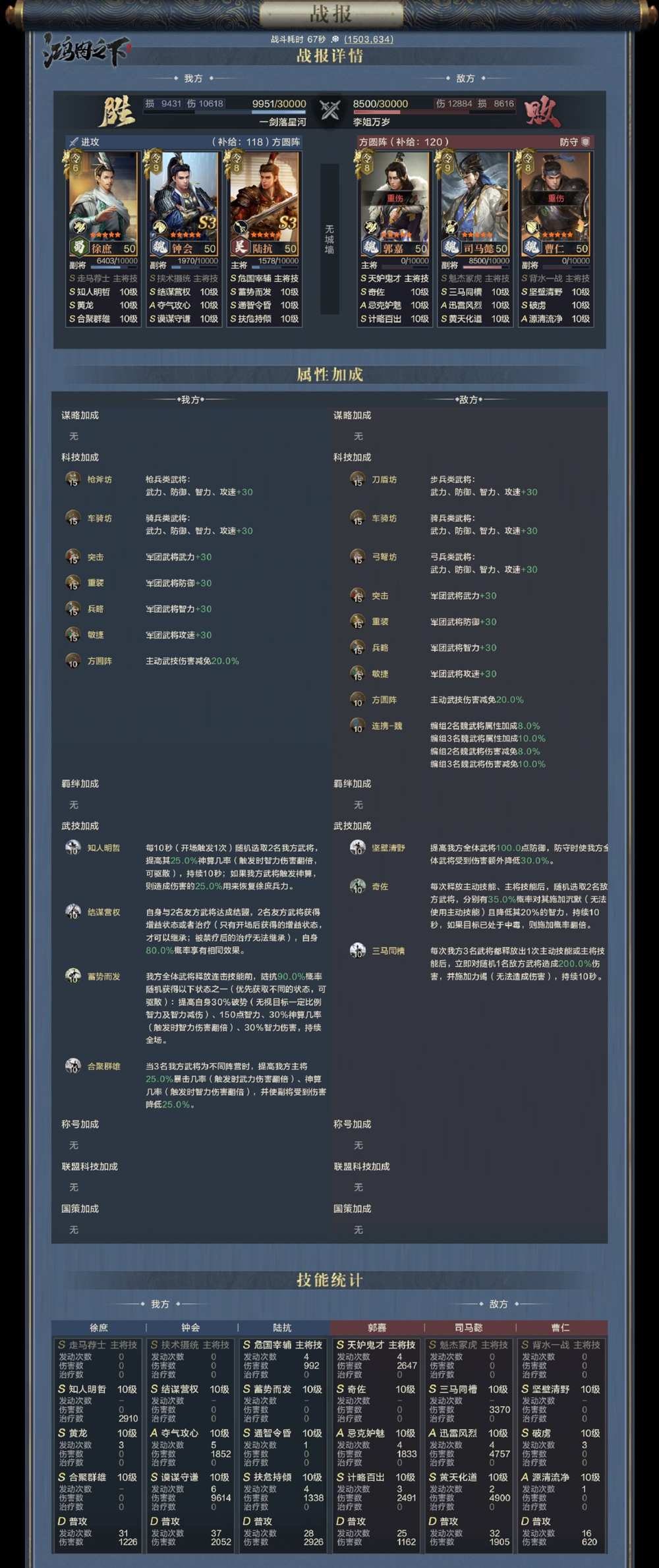 队伍叠连击次数——陆抗起四种Buff——钟会继承四种Buff——打出高额输出和回复效果——神算伤害给徐庶大量回血——钟会继承并回血自身——利用双前排回复能力和高额Buff加持下的双输出高伤害取得战斗胜利。