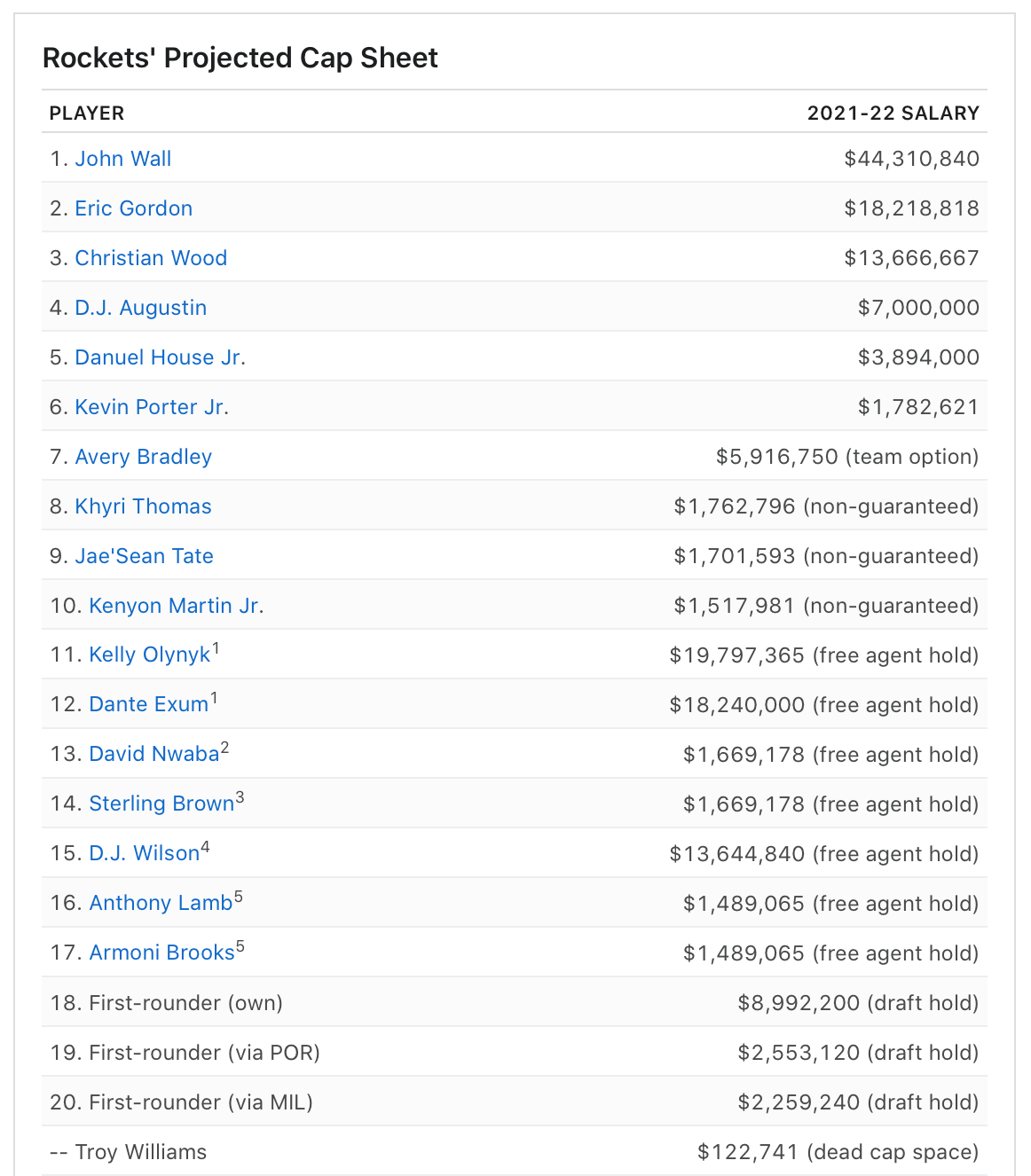 考虑到火箭的三个首轮选秀权以及布拉德利的 590 万美元球队选项,火箭队的薪资空间是健康的。如果布拉德利的球队选项被放弃,考虑到球队拥有 950 万美元的中级特例、380 万美元的双年特例和球队拥有的交易特例,休斯顿的薪资空间仍然比奢侈税线低 2300 万美元。