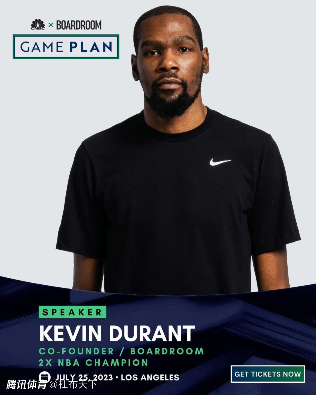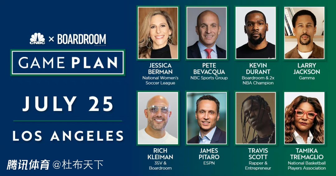 杜兰特旗下公司Boardroom和CNBC将于7月25日在洛杉矶联合举办“GamePlan研讨交流会”。活动将邀请来自体育领域最有影响力的运动员、经营者、投资者和创新者参加。