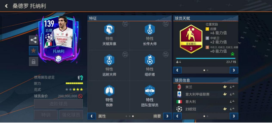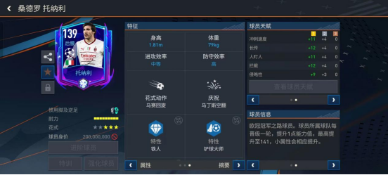 特性方面,托纳利拥有八项豪华特性,其中,铁人让托纳利不易受伤,增强他的对抗能力;铲球大师以及解围大师的配备提升了托纳利的铲抢能力以及解围稳定性;远射大师则让他的远射能力更加强劲,AI远射倾向也更高。