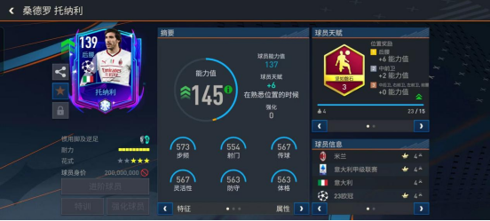 数据方面,这张托纳利拥有137的初始能力值,天赋给到坚如磐石,给他的冲刺速度、长传、人盯人、拦截、侵略性五项数据带来提升。经天赋提升后拦截让托纳利在防守时拥有稳定的阻击效果,冲刺速度的提升让司职后腰的他补防协防迅速,防守参与度极高。