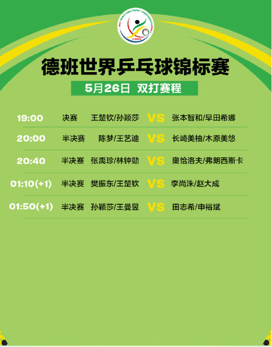 2023年德班世乒赛激战正酣,前6个比赛日,中国队整体发挥稳定,单打方面,出战的男女各5名选手悉数取胜晋级八强,国乒健儿实力超群、风头无两;双打方面,出战的五对选手中,除混双林诗栋/蒯曼不敌日本组合,止步半决赛,其余组合全部晋级,其中:女双陈梦/王艺迪和孙颖莎/王曼昱两对组合,以及男双樊振东/王楚钦晋级四强,混双王楚钦/孙颖莎则闯进决赛!今晚,将进行混双决赛、男女双半决赛和单打1/4决赛,希望国乒健儿再接再厉,混双能够如愿捧杯,男女双打闯入决赛,单打继续高歌猛进,加油!