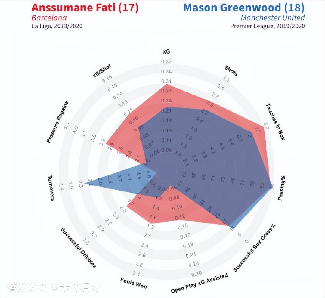 在受伤之前,法蒂从对比数据看,甚至优于比自己还大一岁、正处于高速上升期的格林伍德。