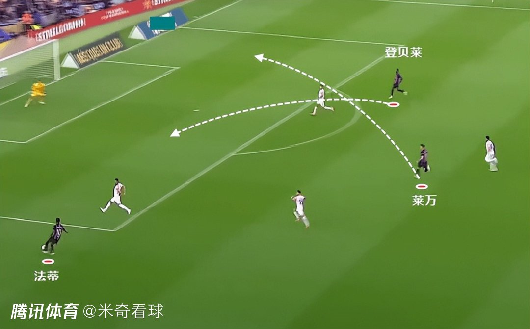 这一波的反击,法蒂从侧翼拿球推进,登贝莱和莱万完成一个很有味道的交叉跑。