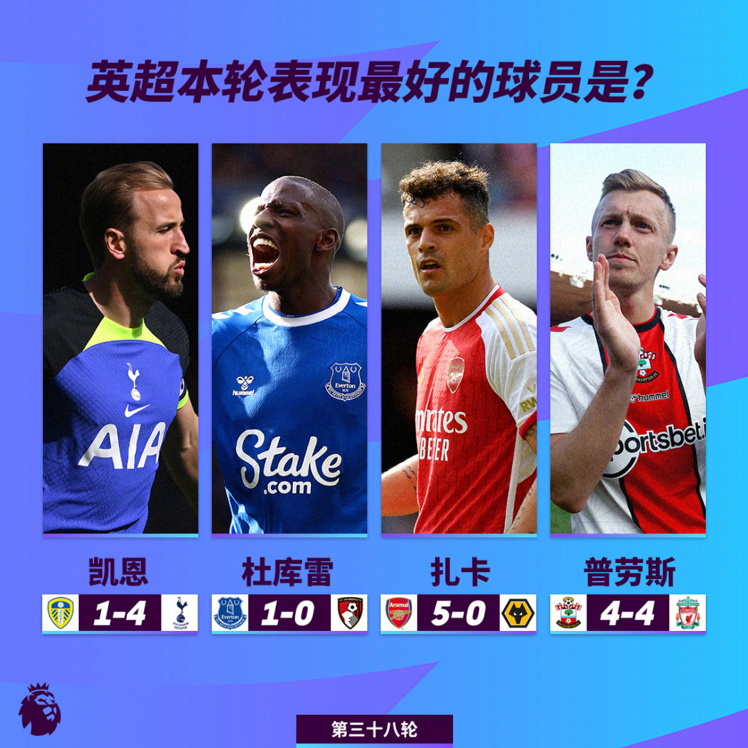 2022/23赛季英超第三十八轮周最佳球员票选 凯恩梅开二度破30球大关 杜库雷一球定乾坤 扎卡梅开二度完美谢幕 沃德-普劳斯一球吹响反击号角 谁最让你印象深刻?