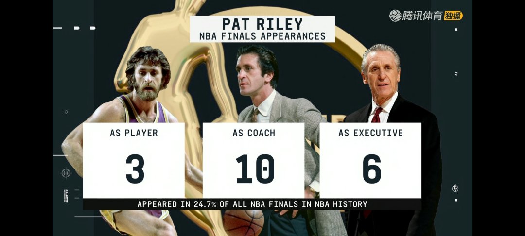 帕特莱利真的是NBA的总冠军见证者。 今年是莱利第19次进入总决赛,而NBA历史25%的总决赛都有莱利的身影(球员时期3次、教练时期10次、高管期间6次)。 莱利也在连续6个十年以不同身份均进入过总决赛。也许您还喜欢:世界杯直播 亚洲杯直播 欧洲杯直播 足球直播