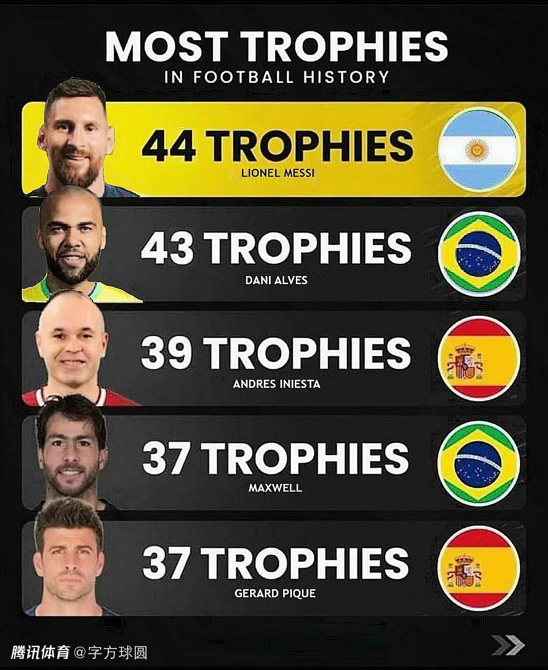 这又是梅西职业生涯第44冠,从此不再与阿尔维斯共享历史第一!