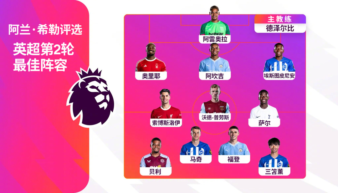 阿兰·希勒2023/24赛季英超第二轮最佳阵容 最佳主帅——德泽尔比 布莱顿三将领衔,曼城两人入选,阿雷奥拉镇守大门