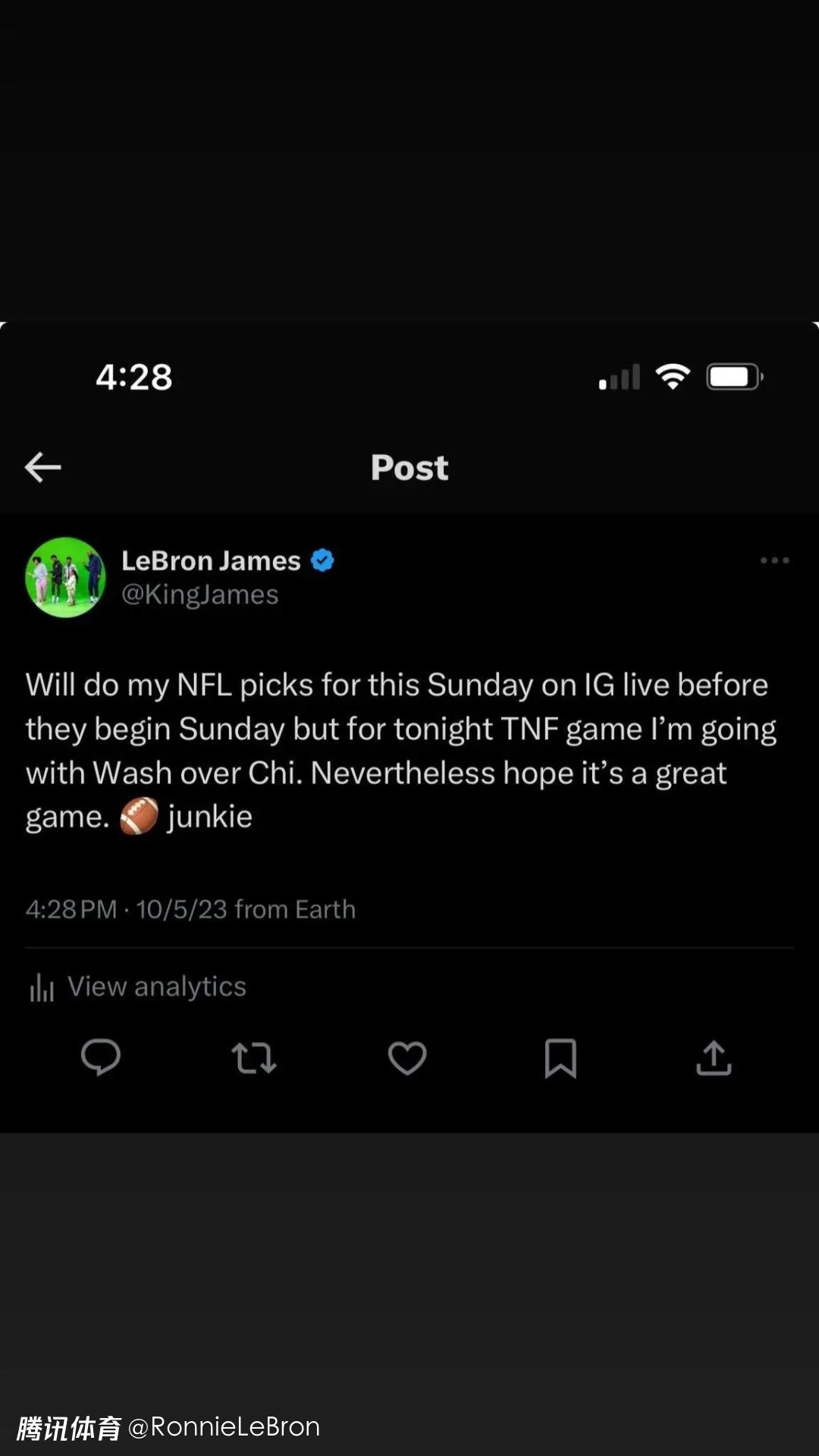 詹姆斯更新推特,预告他本周的NFL比赛预测。 “我会在周日比赛开始前在Instagram直播上进行我的本周日NFL比赛预测。不过,对于今晚的TNF比赛,我会预测华盛顿击败芝加哥。无论如何,希望这是一场精彩的比赛。橄榄球??铁粉。”詹姆斯写道。 一位网友提问詹姆斯对上周NFL比赛的预测准确度如何,他回复道:“12-2(12场命中,2场错误)。” 詹说体育?#詹姆斯确认缺席湖勇大战#也许您还喜欢:世界杯直播 亚洲杯直播 欧洲杯直播 足球直播