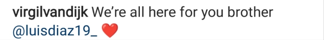 ??北京时间10月30日,英超利物浦球员范戴克通过个人社媒发布消息,力挺队友路易斯-迪亚斯,称“兄弟,我们与你同在”。
