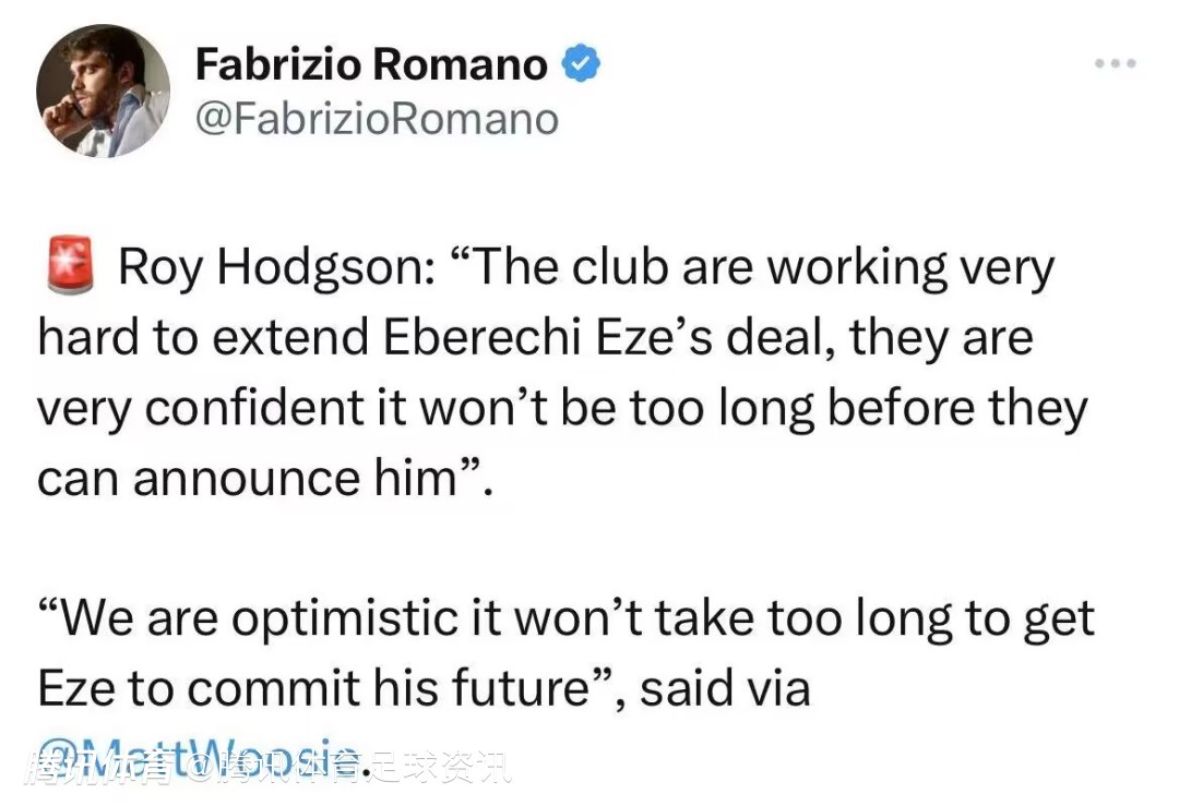 霍奇森:水晶宫俱乐部不久就会和埃泽续约