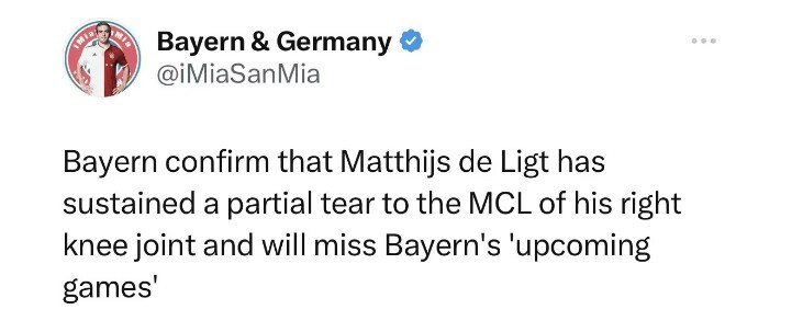 北京时间11月2日,拜仁确认荷兰中卫德里赫特右膝关节内侧副韧带部分撕裂,无缘本周末的国家德比。